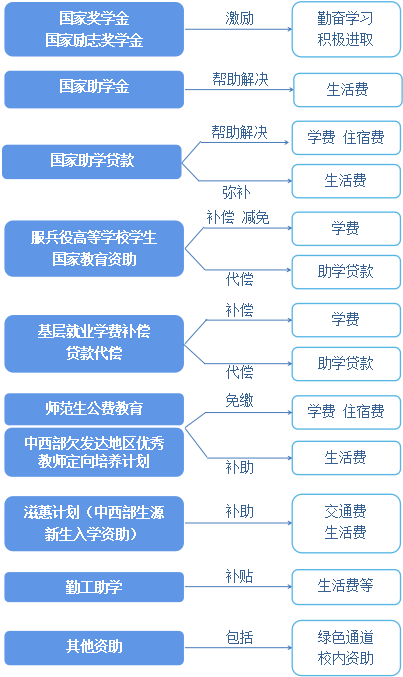 国家在高等教育本专科阶段建立起国家奖学金、国家励志奖学金、国家助学金、国家助学贷款等多种形式有机结合的高校学生资助政策体系。