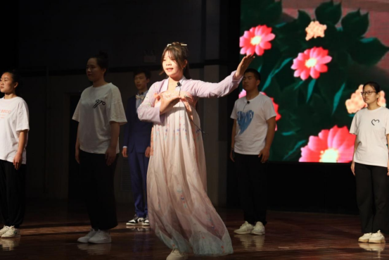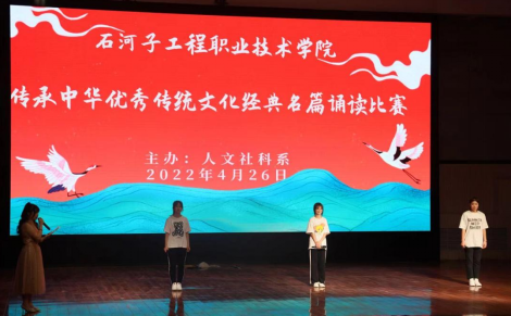 建筑工程系、机电工程系、人文社科系的参赛选手依次为大家诵读了经典篇目《将进酒》,用不同的吟诵形式将“人生得意需尽欢,莫使金樽空对月,天生我材必有用,千金散尽还复来”表现得淋漓尽致,使听者仿佛置身于诗仙李白的豪情逸兴中。